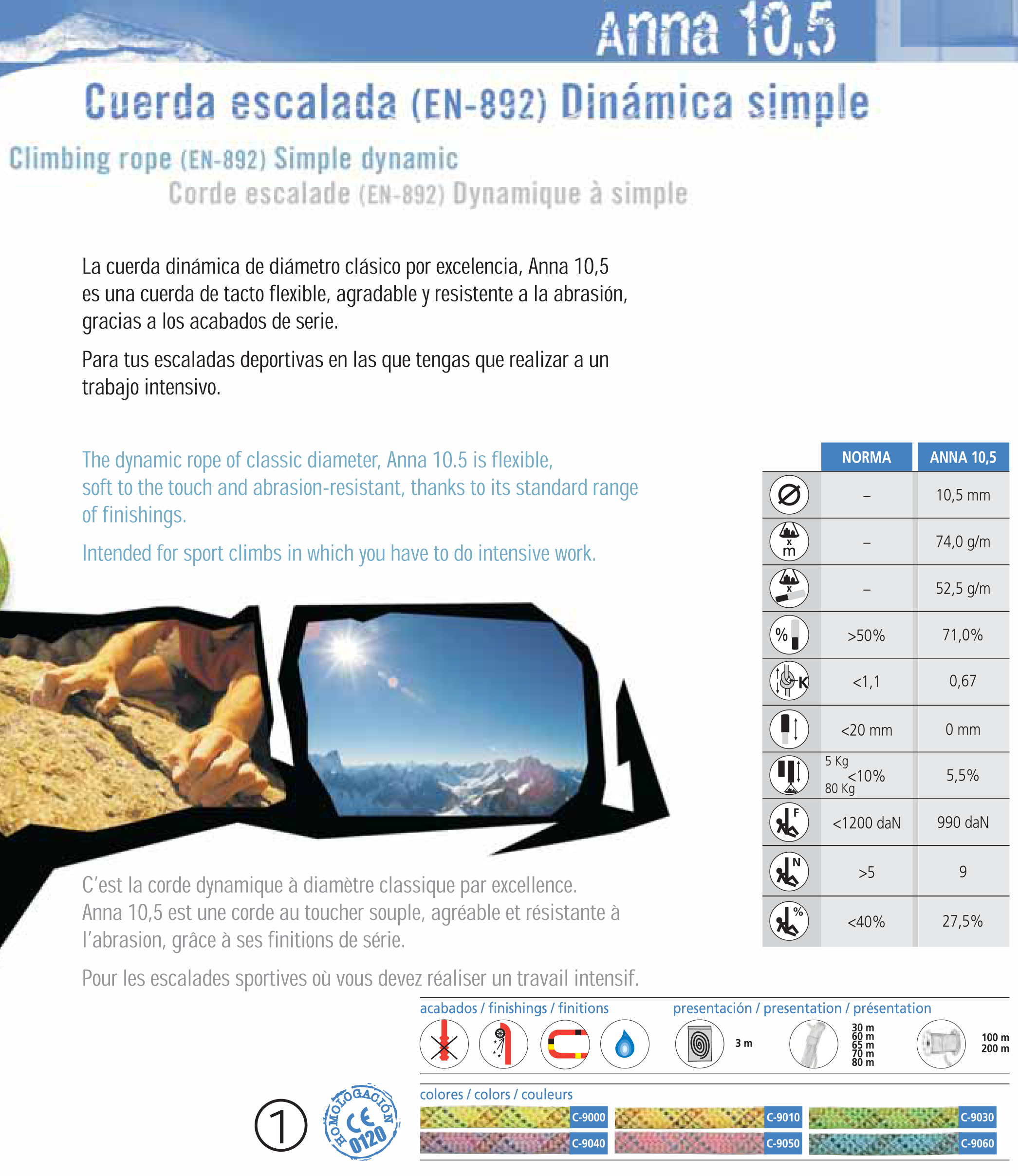 La cuerda dinamica de diametro clasico por excelencia, Anna 10.5 es una cuerda de tacto flexible, agradable y resistente a la abrasion, gracias a los acabados de serie.